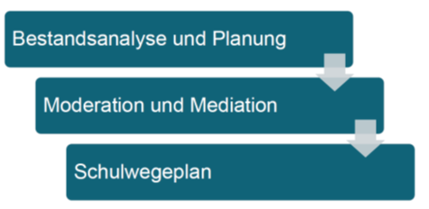In einem mehrphasigen Arbeitsprozess unter Mitwirkung der erforderlichen Akteure (Fachpersonal der Verwaltung, Polizei, Ordnungsbehörden, ÖPNV-Betreiber) und Betroffenen (Personal der Bildungseinrichtungen, Eltern und Elternvertretungen) werden zukunftsfähige Konzepte diskutiert und planerisch bearbeitet. In diesem Zusammenhang wird auch ein Schulwegeplan erstellt werden.