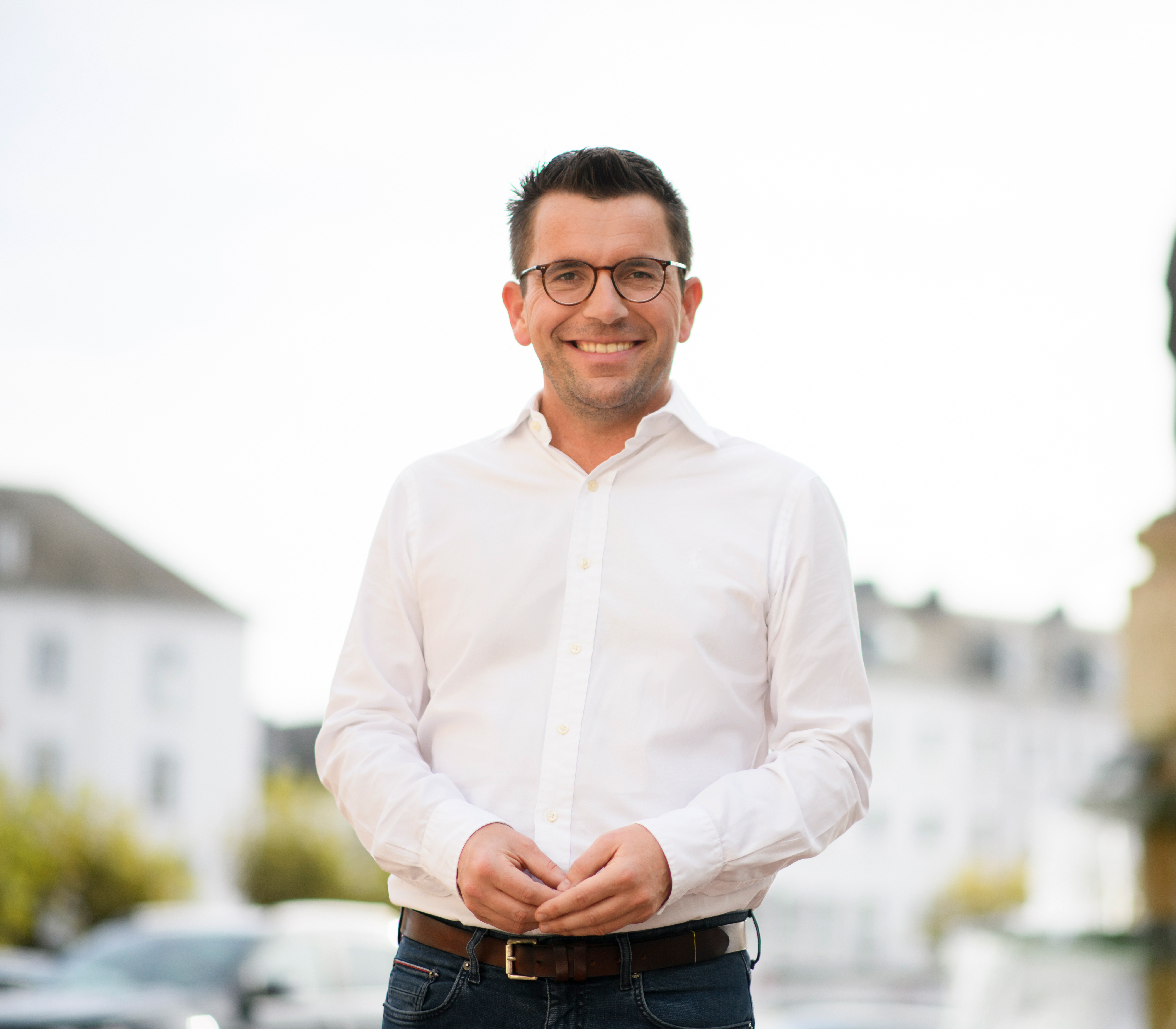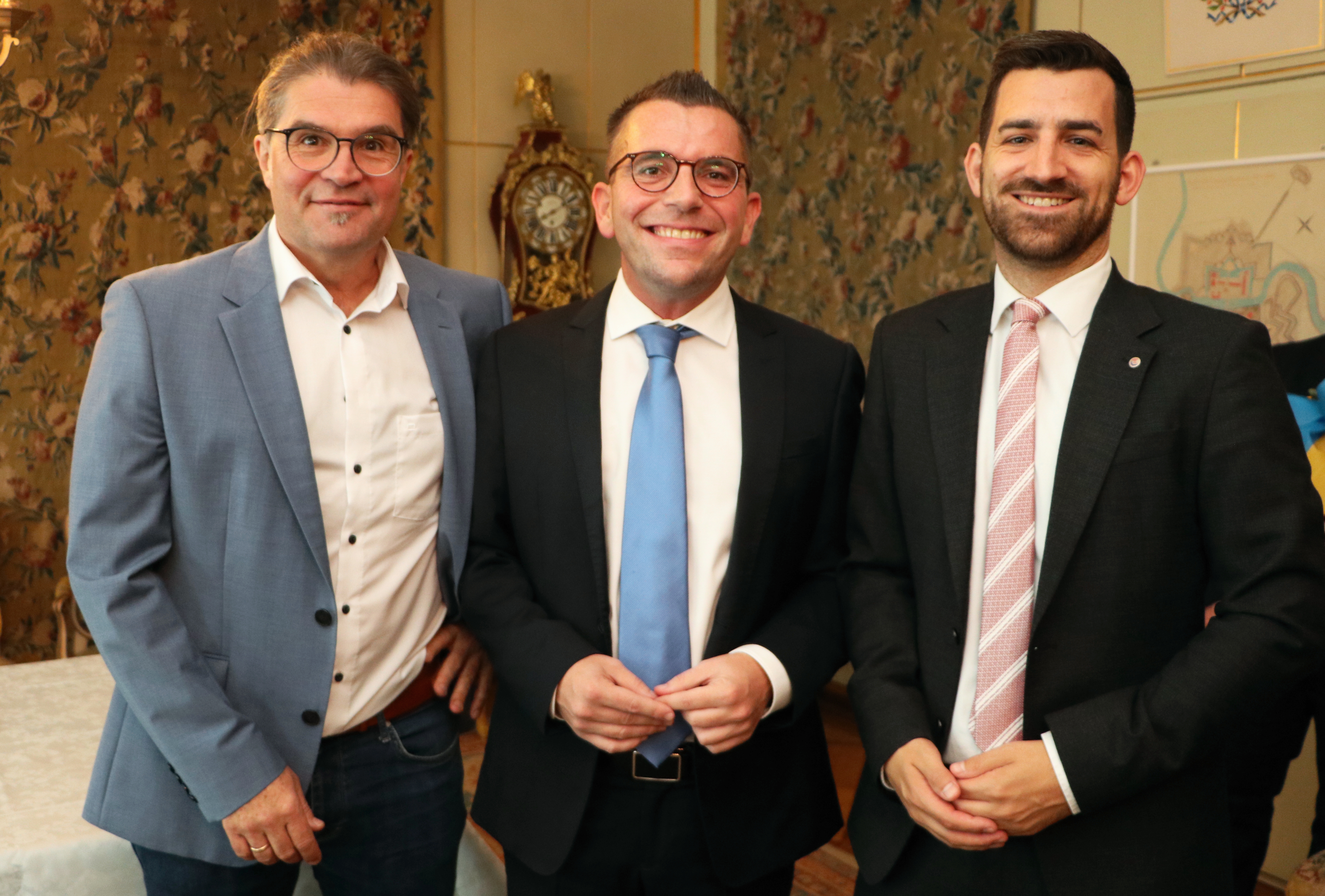 Oberbürgermeister Marc Speicher am Tag seiner Vereidigung mit seinen Kollegen der Verwaltungsspitze, Bürgermeister Carsten Quirin (rechts) und Beigeordneter Gerald Purucker (links).